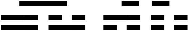 Λοιπόν, από την αλληλεπίδραση του Yin και του Yang δημιουργήθηκαν τα 4 Δίγραμμα. Ο Fu Xi λοιπόν, τοποθετώντας σε κάθε γραμμή από μία Yang και μία Yin, σχημάτισε 4 ζευγάρια γραμμών. Έτσι έχουμε: