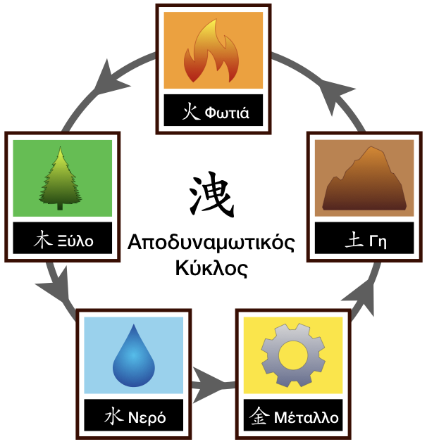 Λέμε λοιπόν ότι το Νερό αποδυναμώνεται από το Ξύλο, το Ξύλο αποδυναμώνεται από τη Φωτιά, η Φωτιά αποδυναμώνεται από τη Γη, η Γη αποδυναμώνεται από το Μέταλλο και το Μέταλλο αποδυναμώνεται από το Νερό.