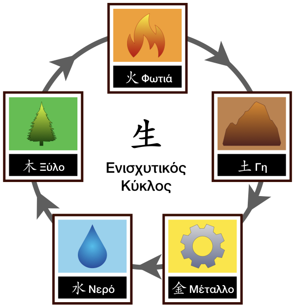 Αναρωτηθήκατε ίσως γιατί τα στοιχεία στο σχέδιο είναι σε κύκλο και όχι π.χ. σε ευθεία γραμμή; Αυτό συμβαίνει γιατί δεν υπάρχει αρχή και τέλος στην ενισχυτική σχέση τους. Ο κύκλος αυτός όπως τον βλέπετε δεν είναι απλά ένα εκπαιδευτικό διάγραμμα. Είναι μία ροή ενέργειας από τη μία φάση του Qi στην άλλη, που δε σταματάει ποτέ. Αυτή τη ροή ενέργειας τη συναντάμε πολύ συχνά στη φύση. Για παράδειγμα οι εποχές μέσα στο χρόνο συμβαίνουν με μία τέτοια σειρά. Το Φθινόπωρο (Μέταλλο) ενισχύει την επόμενη εποχή, το Χειμώνα (Νερό), ο Χειμώνας προετοιμάζει το έδαφος και ενισχύει την Ανοιξη (Ξύλο), η Ανοιξη προετοιμάζει και δυναμώνει το Καλοκαίρι (Φωτιά). Η ροή του Qi είναι ομαλή και αρμονική και η δημιουργία μίας τέτοιας ροής συγκαταλέγεται στις κύριες έγνοιες του εφαρμοστή του Feng Shui.