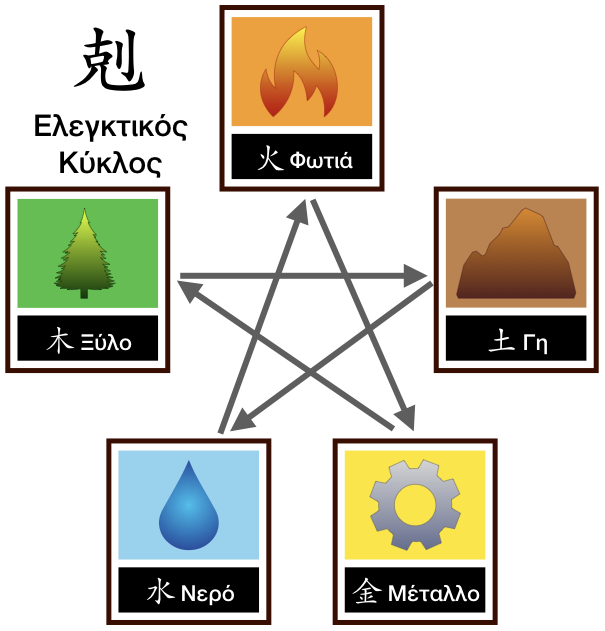 Το Νερό ελέγχει τη Φωτιά, η Φωτιά ελέγχει το Μέταλλο, το Μέταλλο ελέγχει το Ξύλο, το Ξύλο ελέγχει τη Γη, η Γη ελέγχει το Νερό. Συχνά ο κύκλος αυτός αναφέρεται ως «Καταστροφικός Κύκλος», αλλά ο όρος δεν είναι σωστός.